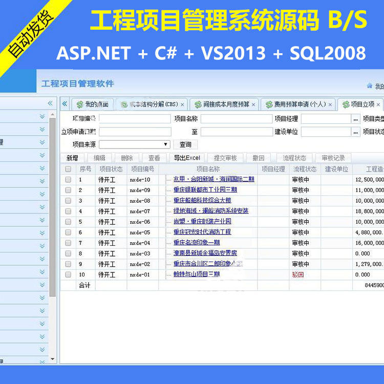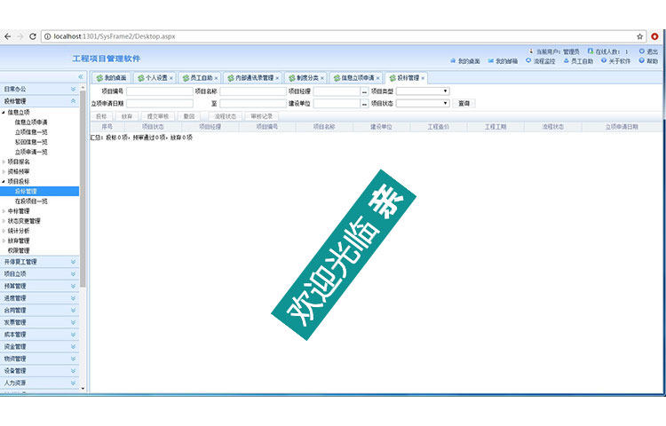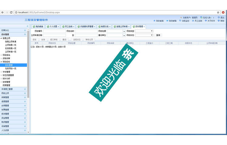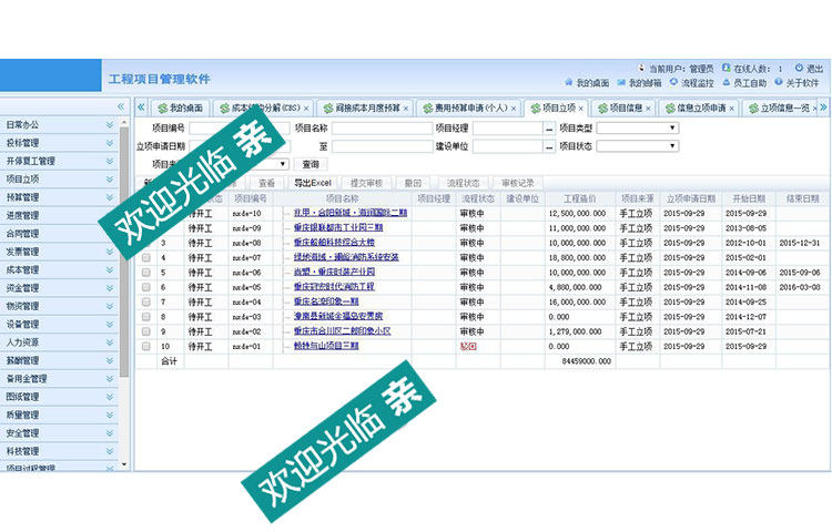1.日常办公 2.投标管理 3.开停复工管理 4.项目立项 5.预算管理 6.进度管理