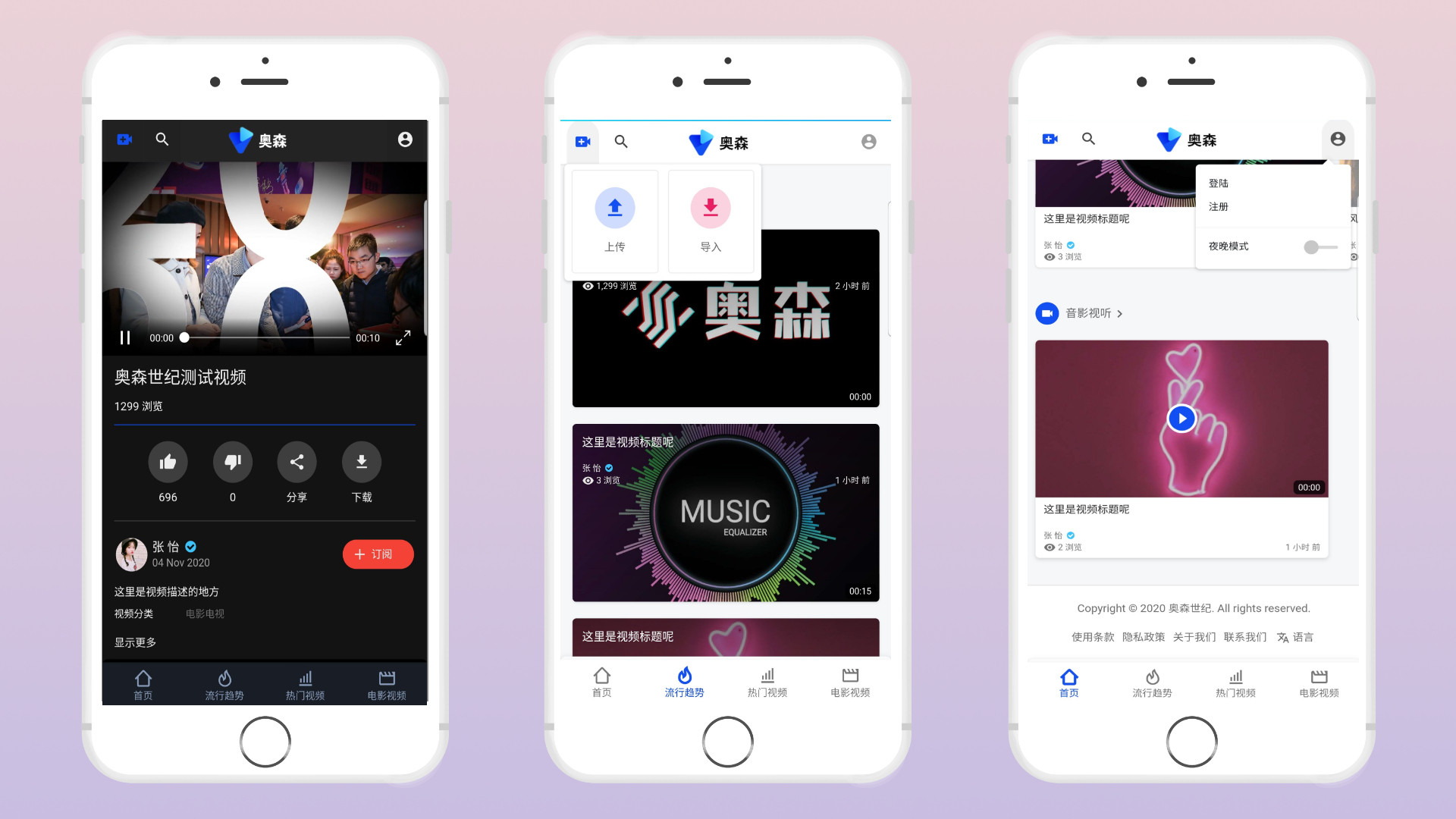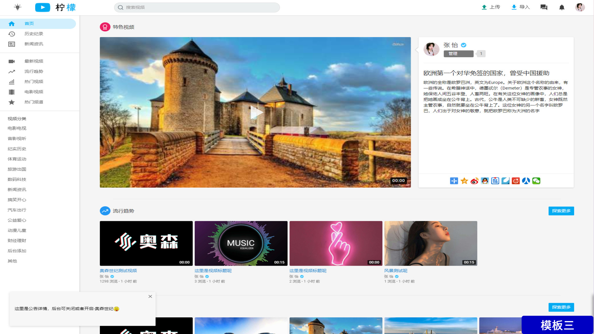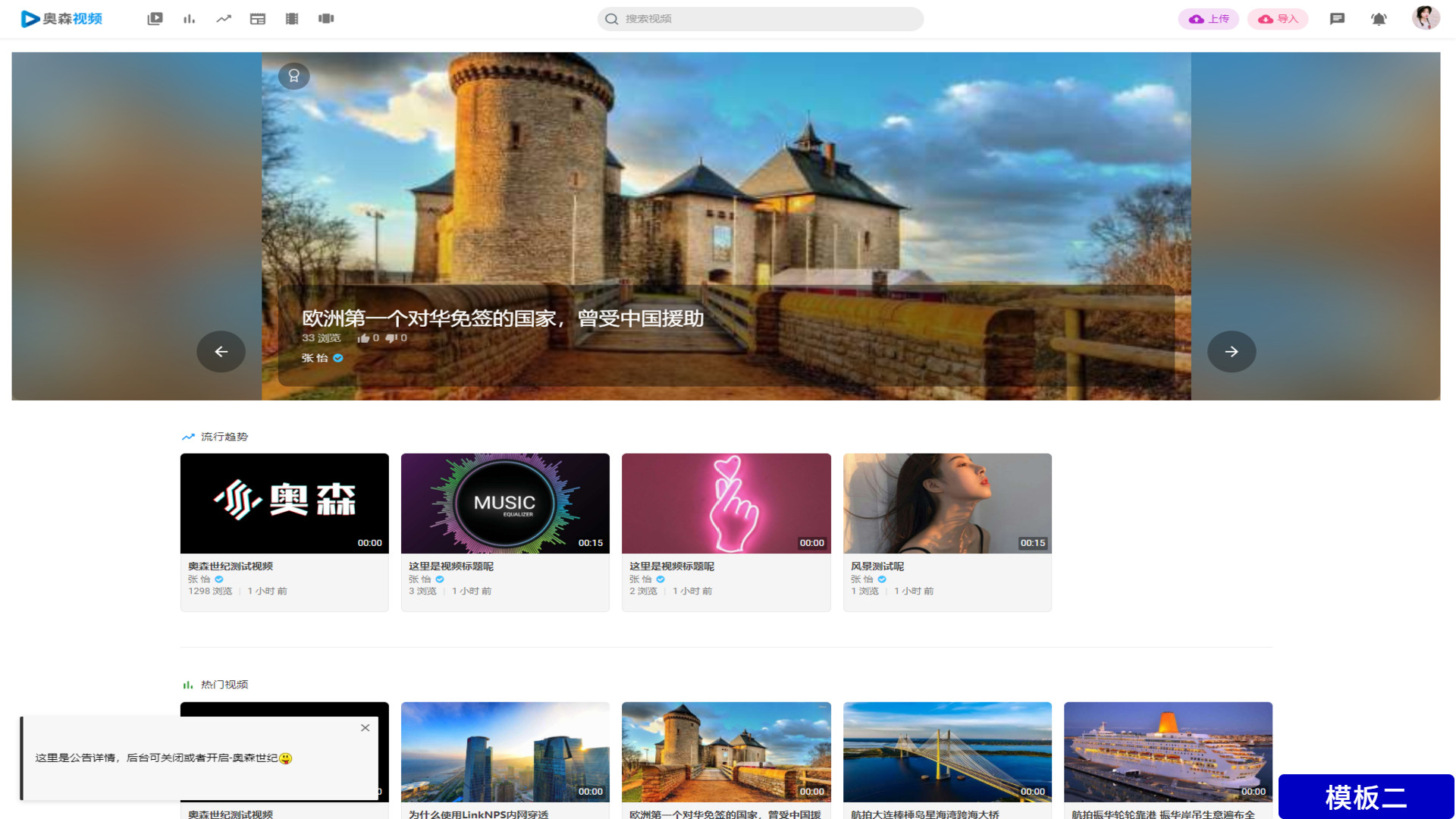 此源码是一款视频网站系统,你可以用这个来快速搭建自己的视频网站,安装简单、界面简洁、易于使用。用户可在网站上面注册登陆上传视频、发布评论与收藏视频,系统带护眼模式,有利于保护眼睛,与此同时提供了后台管理,管理员可以进行网站名称,logo等设置。网站采用响应式设计,因此不论你在什么设备浏览网站,都有非常好的体验。