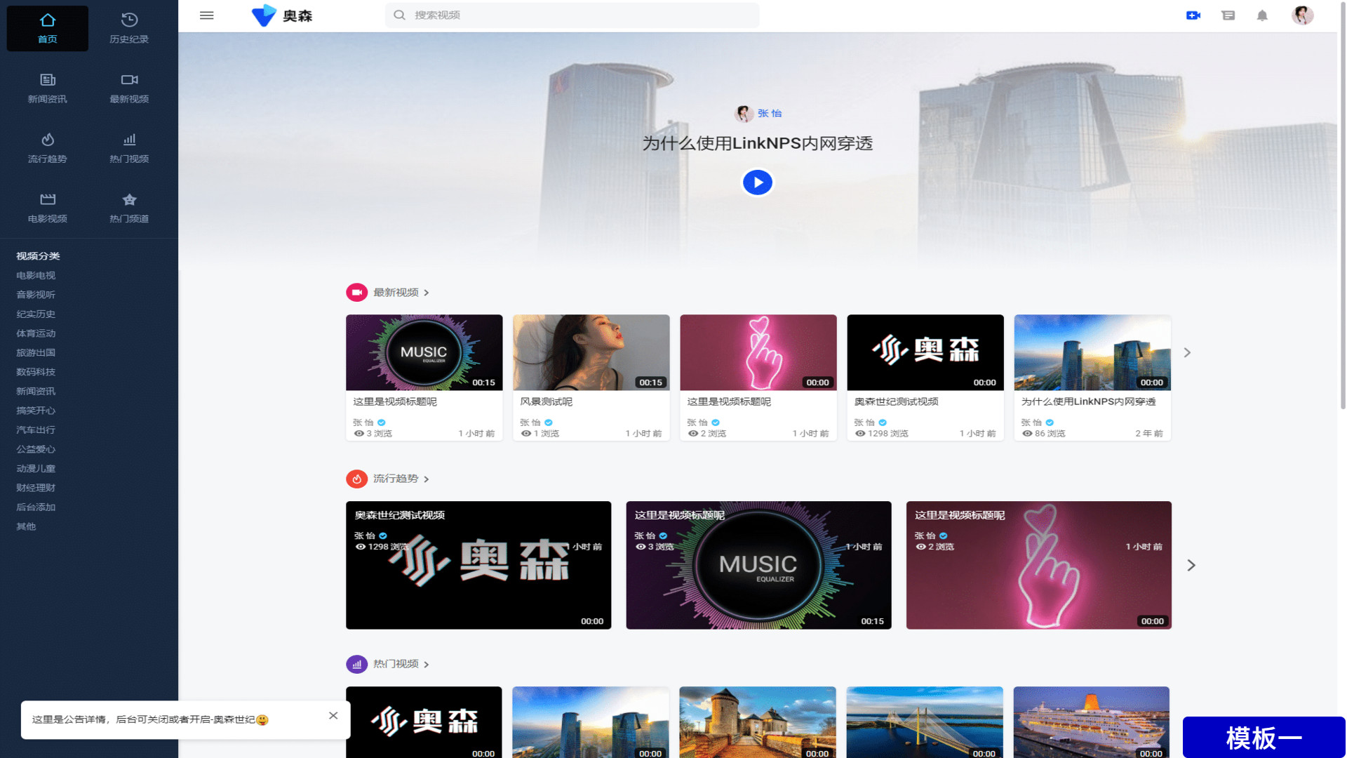 上传视频-导入视频-点赞系统-评论系统-订阅、历史记录、-用户频道-播放列表-多语言-地图生成、-广告系统-友好的搜索引擎-大气的用户界面