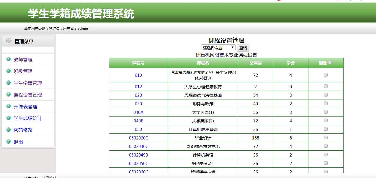 4. 【课程设置管理】 对各专业的课程设置表进行查、增、删、改。