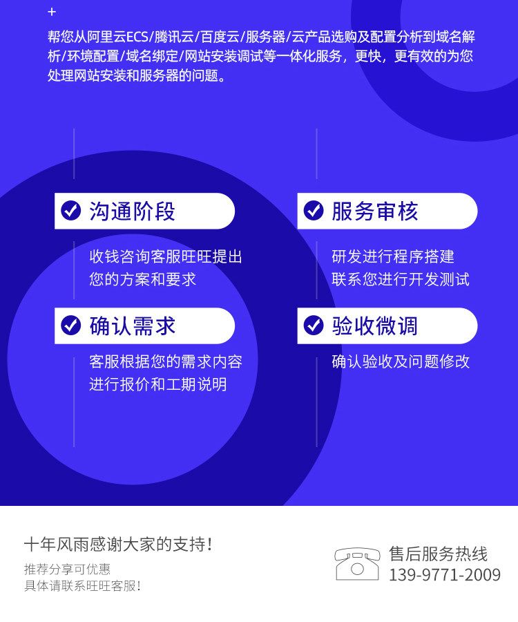 帮您从阿里云ecs/腾讯云/百度云/服务器/云产品选购及配置 分析到域名解析/环境配置/域名绑定/网站安装调试等一体化 服务,更快,更有效的为您处理网站安装和服务器的问题。