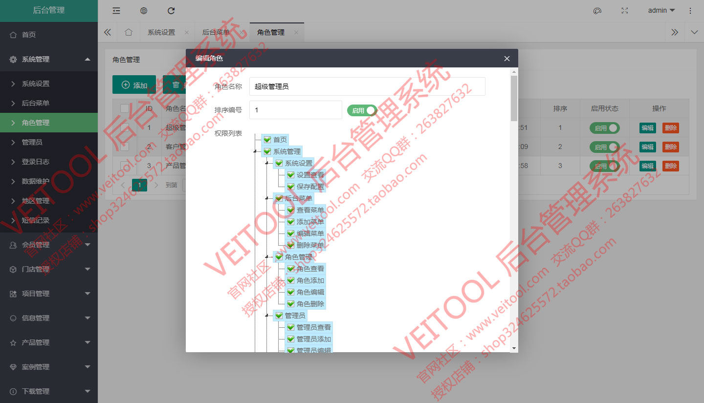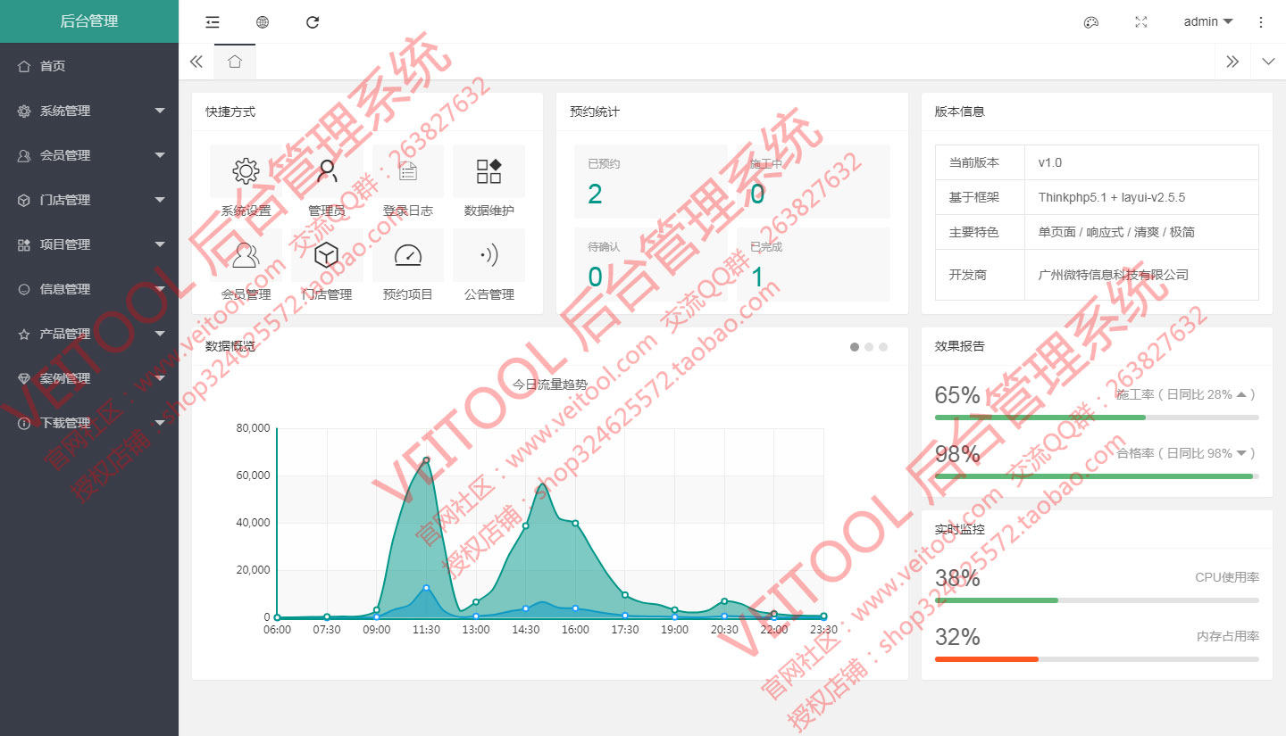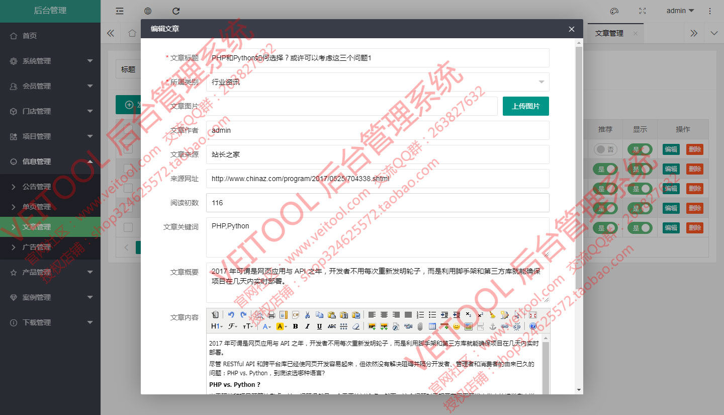 Veitool PHP后台内容管理系统:基于ThinkPHP5.1.41+Layui2.6.8(单页异步加载模式)架构设计。自主程序开发源码,逻辑清晰、界面美观、安全稳定。完善的权限机制,可控制到具体的细节操作权限配置,适用于企业网站、以及用于其他管理系统的二次开发扩展。一次购买,永久使用,安全、稳定、快捷。可接受功能定制,定制费用另行商议。后台入口地址可变。